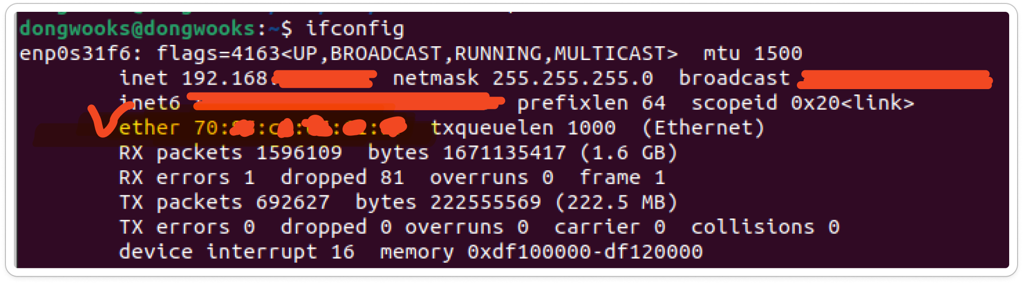 다시 ifconfig를 터미널에 입력하고 mac 주소를 알아봅시다.