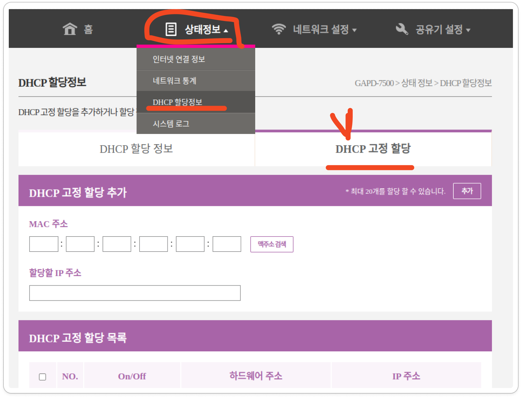 고정할당을 위해 일단 MAC 주소를 알아야 합니다.
