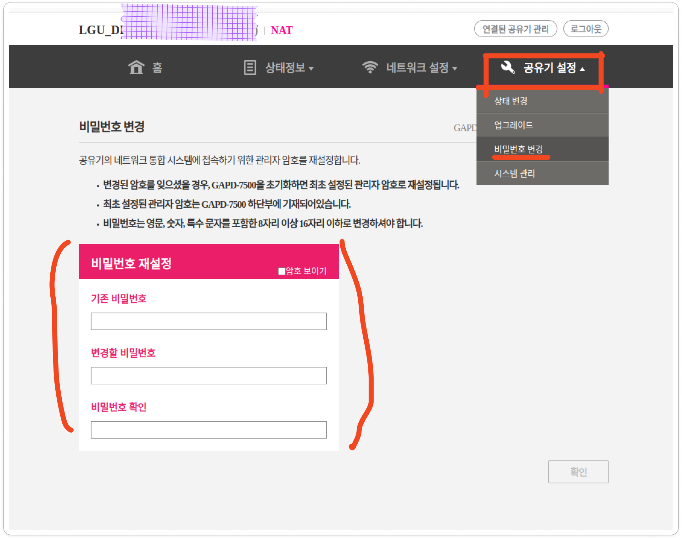 상단 탭 > 공유기 설정 > 비밀번호 변경