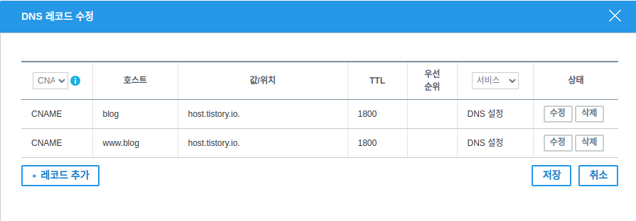 설정을 눌러서 레코드 추가를 진행하도록 합시다.